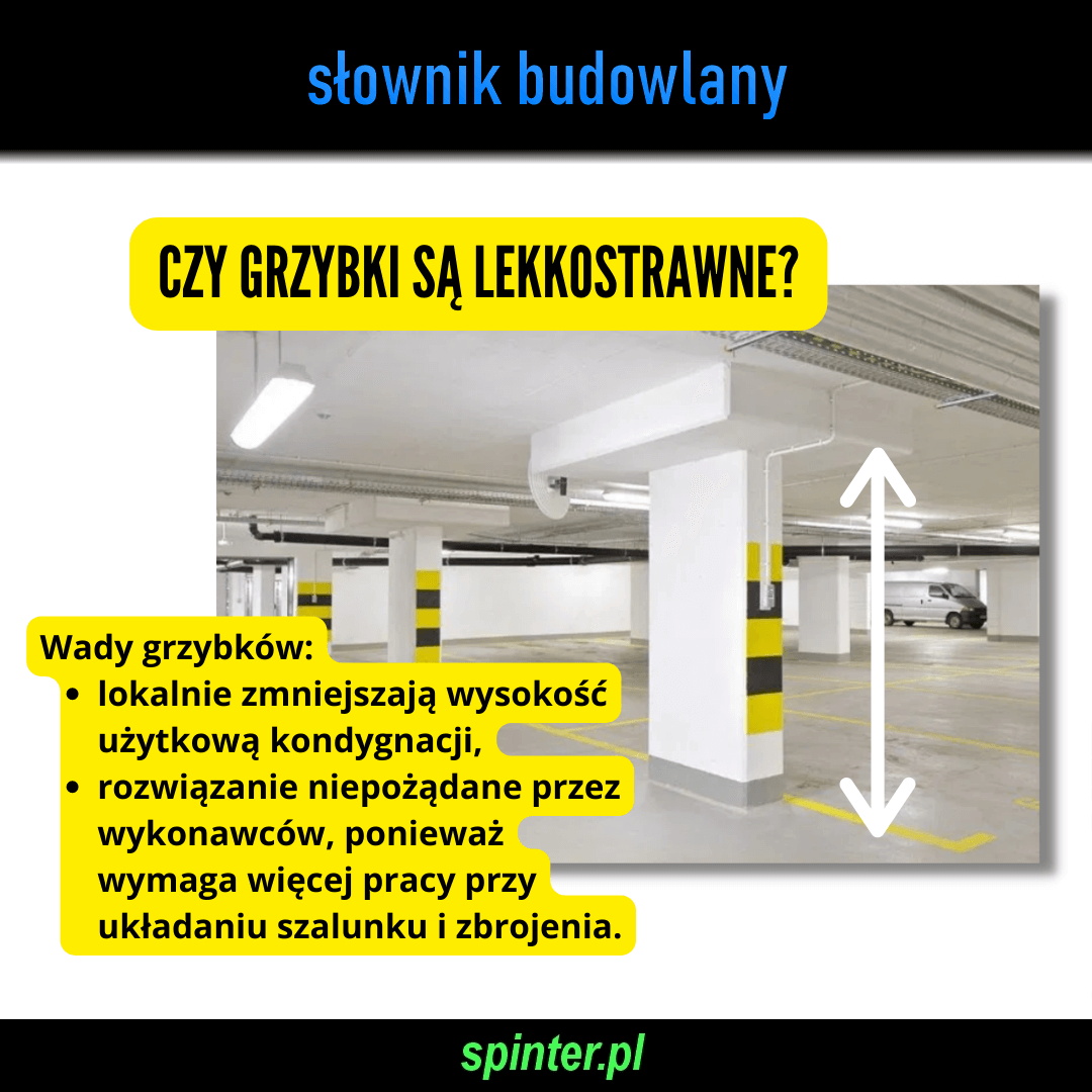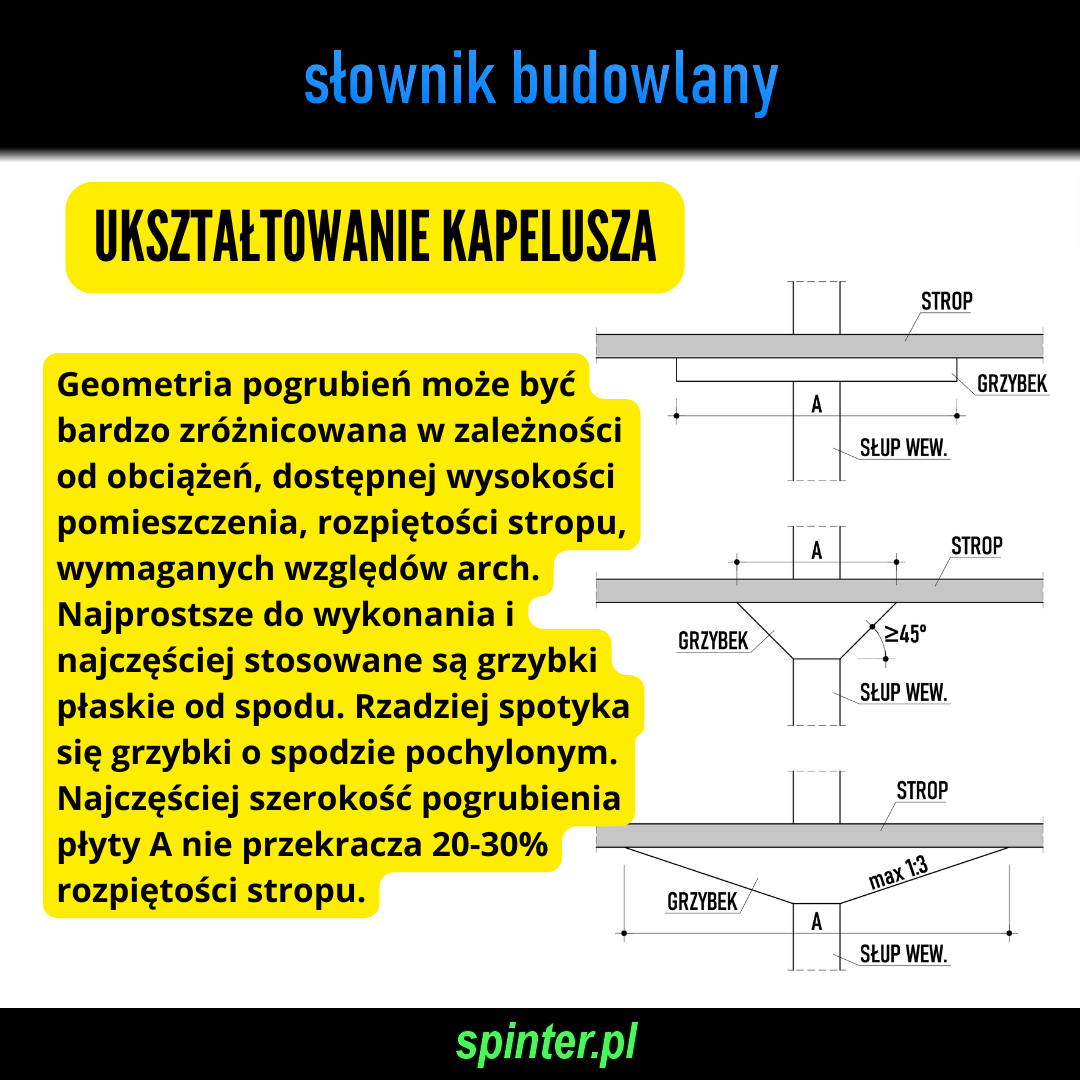 Wady grzybków: – lokalnie zmniejszają wysokość użytkową kondygnacji, – rozwiązanie niepożądane przez wykonawców, ponieważ wymaga więcej pracy przy układaniu szalunku i zbrojenia. Ukształtowanie kapelusza Geometria pogrubień może być bardzo zróżnicowana w zależności od obciążeń, dostępnej wysokości pomieszczenia, rozpiętości stropu, wymaganych względów architektonicznych. Najprostsze do wykonania i najczęściej stosowane są grzybki płaskie od spodu. Rzadziej spotyka się grzybki o spodzie pochylonym. Najczęściej szerokość pogrubienia płyty nie przekracza 20-30% rozpiętości stropu.