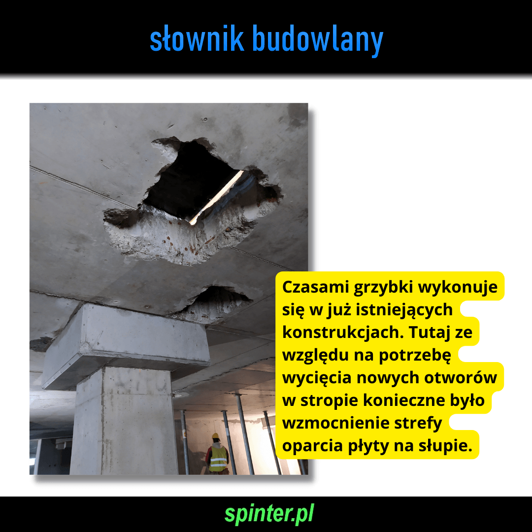Czasami grzybki wykonuje się w już istniejących konstrukcjach np. ze względu na potrzebę wycięcia nowych otworów w stropie, może być konieczne wzmocnienie strefy oparcia płyty na słupie.