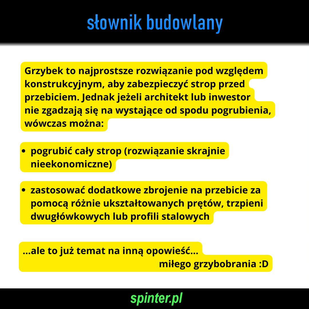 Grzybek to najprostsze i najpewniejsze rozwiązanie pod względem konstrukcyjnym, aby zabezpieczyć strop przed przebiciem. Jednak jeżeli architekt lub inwestor nie zgadzają się na wystające od spodu pogrubienia, wówczas można: – pogrubić cały strop (rozwiązanie skrajnie nieekonomiczne), – zastosować dodatkowe zbrojenie na przebicie za pomocą różnie ukształtowanych prętów, trzpieni dwugłówkowych lub profili stalowych.